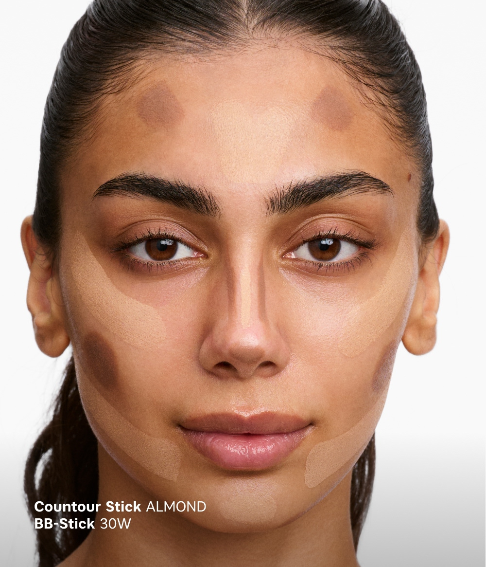 - Contour Stickiä voidaan käyttää antamaan syvyyttä kasvoillesi ja korostamaan luonnollisia varjoja skulptuurisen ilmeen saavuttamiseksi. Levitä Contour Stick suoraan niille kasvojen alueille, joihin haluat lisätä syvyyttä, ja sekoita sitten siveltimellä saumattoman lopputuloksen saavuttamiseksi.