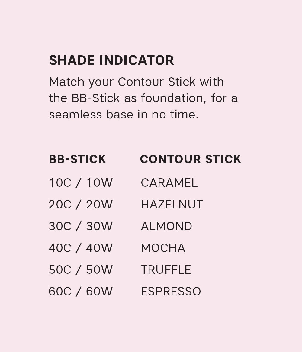 - BB Stick ja Contour Stick jakavat saman kevyen koostumuksen, jolla on luonnollinen lopputulos ja rakennettava peittävyys. BB Stickillä on sävyjä, jotka toimivat meikkivoiteena tai bronzerina, kun taas Contour Stickin sävyt on suunniteltu jäljittelemään kasvojen luonnollisia varjoja. Siksi ne ovat viileämpiä ja harmahtavia skulptuurisen vaikutuksen saavuttamiseksi.