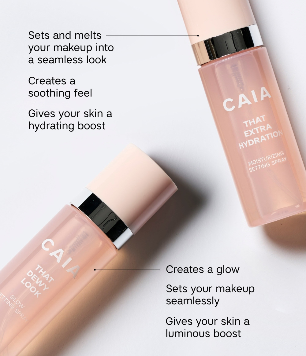 Suosituimmat tuotteemme ovat vihdoin saatavilla pienemmässä koossa – täydellinen kannettavaksi käsilaukussa tai otettavaksi mukaan matkalle. That Dewy Look antaa taianomaisen hehkun ja That Extra Hydration kosteuttaa ihoa. Suihke saa meikin sulautumaan yhteen ja pysymään paikallaan koko päivän. Käytä meikin alla, meikatessasi ja meikin jälkeen saavuttaaksesi tasaisen, pitkäkestoisen ja säteilevän lopputuloksen.